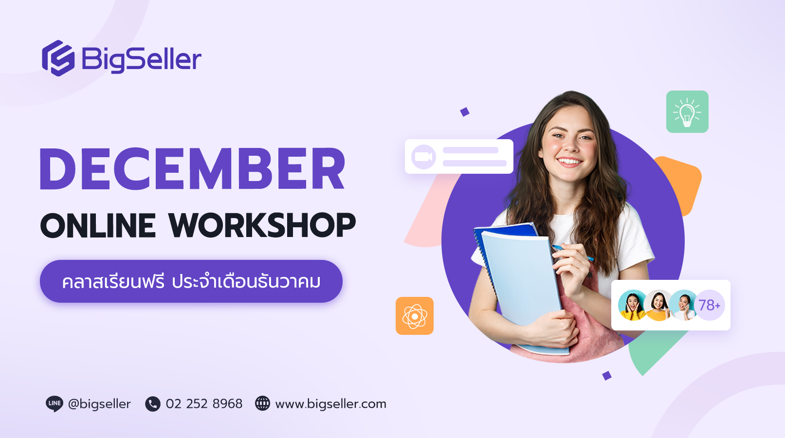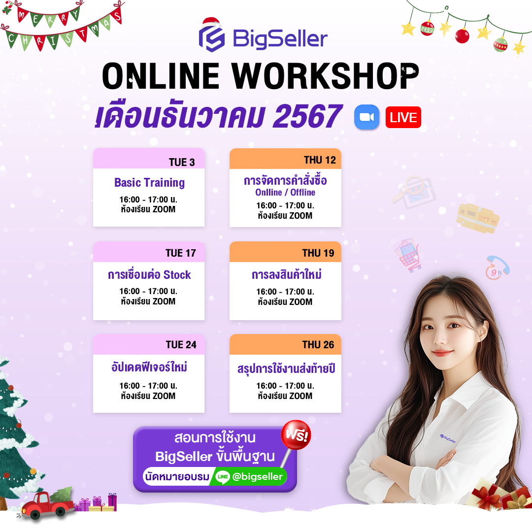 อบรมประจำสัปดาห์ตลอดเดือนธันวามคม เพื่อช่วยเหลือผู้ขายที่พึ่งผูกร้านค้าเข้ามาใช้งานระบบ Bigseller ใหม่เพื่อพัฒนาร้านค้าและจัดการออเดอร์อย่างเป็นระบบ โดยสามารถเลือกคลาสเรียนที่เหมาะสมและลงทะเบียนเข้าเรียนฟรีได้ตลอดทั้งเดือน