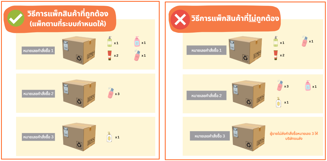 ผู้ขายจำเป็นต้องแพ็กสินค้าลงไปในกล่องตามที่ระบบระบุไว้ในแต่ละหมายเลขคำสั่งซื้อ และติดใบปะหน้าให้ตรงตามกล่องเท่านั้น