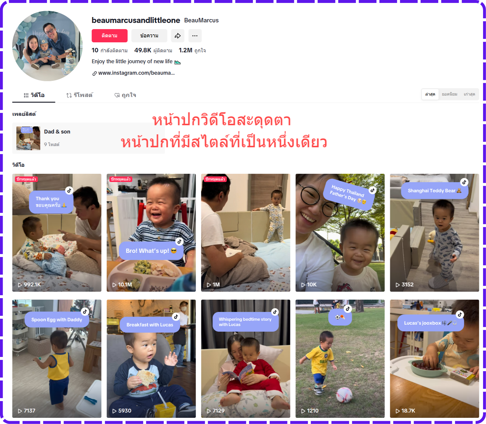 เริ่มวิดีโอด้วยจุดสำคัญ ใช้สีสันและสัญลักษณ์ช่วยจัดหมวดหมู่วิดีโอในโปรไฟล์ หรือใช้ภาพหน้าปกที่มีรูปแบบเดียวกัน เพื่อความสม่ำเสมอและความสะดวกในการค้นหา