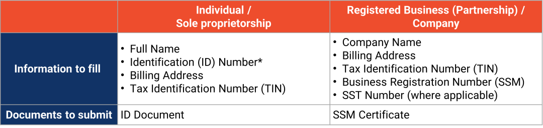 *Identity number options include NRIC, MyPR/Red Card, MyTentera, passport and visa