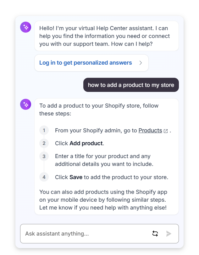Type your question in the search bar (e.g., "how to add a product to my store").