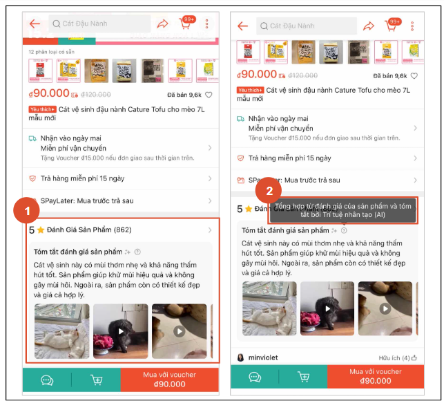 Đây là tính năng tổng hợp các đánh giá về một sản phẩm được tóm tắt bởi Trí tuệ nhân tạo (AI). Với tính năng này Người mua sẽ có thông tin đánh giá tổng quát về sản phẩm từ những người dùng khác, từ đó có thể đưa ra quyết định mua hàng nhanh chóng. Tính năng này hiển thị ở mục “Tóm tắt đánh giá sản phẩm” như hình bên dưới.Nội dung này được tổng hợp/tóm tắt từ đánh giá của nhiều người dùng khác nhau. Người mua có thể tham khảo thêm các đánh giá chi tiết của từng người dùng liên quan đến sản phẩm trước khi đưa ra quyết định mua hàng.