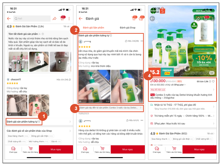 Đánh giá sản phẩm tương tự là tính năng tổng hợp chi tiết các đánh giá của sản phẩm tương tự đã được giao dịch thành công trên Shopee bởi những Người mua khác, để giúp Người mua có thêm thông tin tham khảo về sản phẩm trước khi quyết định mua hàng. Tính năng này hiển thị như các hình ảnh bên dưới, trong đó: