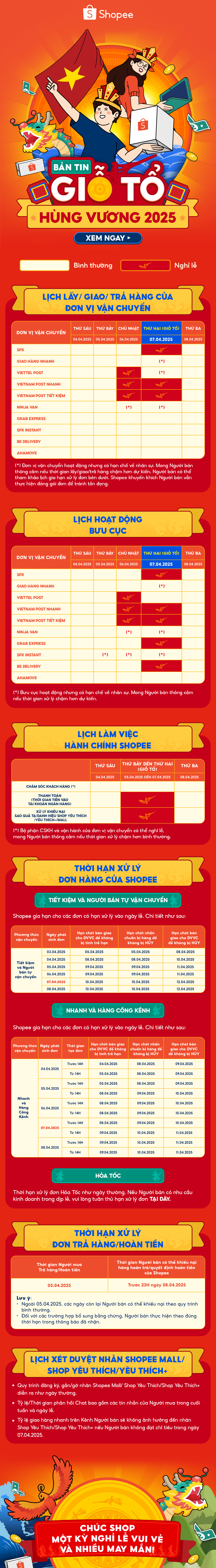 Lịch làm việc của Shopee và các Đơn Vị Vận Chuyển Giỗ Tổ Hùng Vương 2025