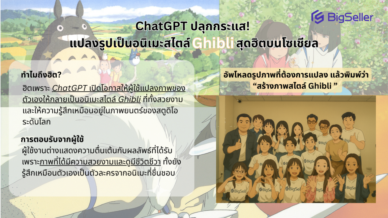หลังจากที่ OpenAI อัปเดตฟีเจอร์สร้างรูปภาพของ ChatGPT การแปลงภาพของตัวเองให้กลายเป็นอนิเมะสไตล์ Ghibli กลายเป็นกระแสที่ฮิตมากในโซเชียลมีเดียในช่วงนี้ หลายคนไม่พลาดที่จะลองแปลงรูปของตนเองเป็นภาพอนิเมะในสไตล์ที่ได้รับความนิยมและมีเสน่ห์ในแบบที่สตูดิโอ Ghibli เคยสร้างขึ้น