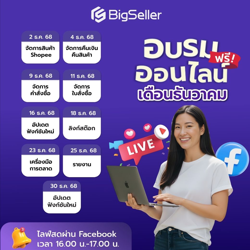 อบรมประจำสัปดาห์ตลอดเดือนพฤศจิกายน เพื่อช่วยเหลือผู้ขายที่พึ่งผูกร้านค้าเข้ามาใช้งานระบบ Bigseller ใหม่เพื่อพัฒนาร้านค้าและจัดการออเดอร์อย่างเป็นระบบ โดยสามารถเลือกคลาสเรียนที่เหมาะสมและลงทะเบียนเข้าเรียนฟรีได้ตลอดทั้งเดือน