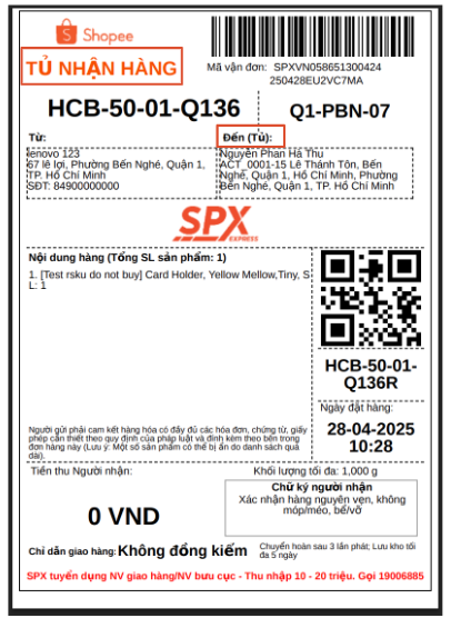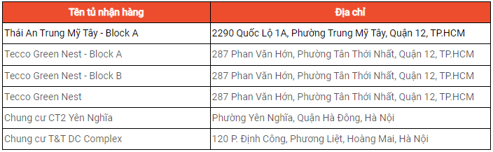 - Giai đoạn 1 (từ ngày 12/05/2025): 6 tủ nhận hàng dưới đây sẽ đi vào hoạt động:
