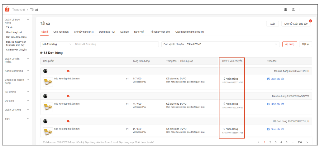 2. Trang Quản lý đơn hàng: hiển thị Tủ Nhận Hàng và Mã vận đơn tương ứng ở cột Đơn vị vận chuyển