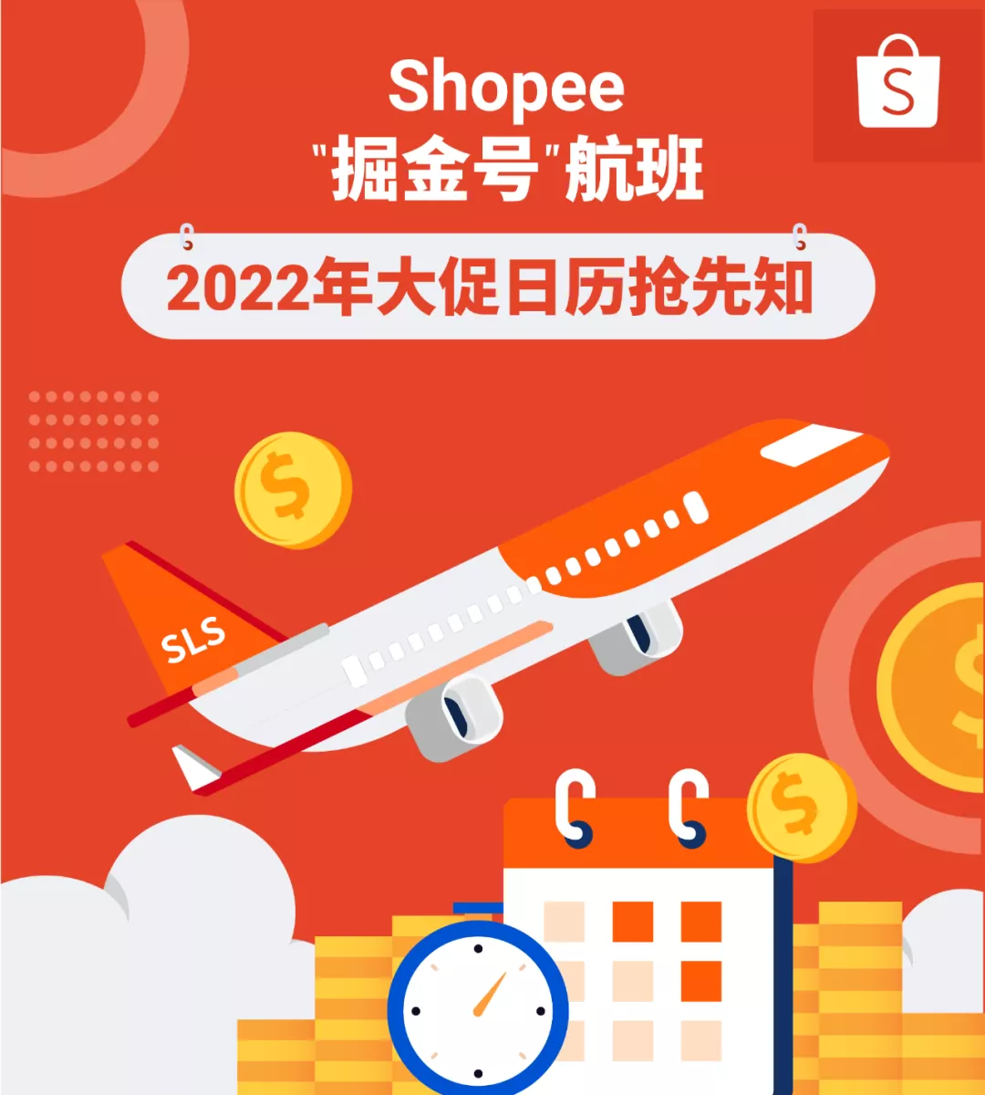 接下来抢先发布Shopee 2022全新大促日历,卖家朋友一起来乘坐“掘金号航班”备战新一年!