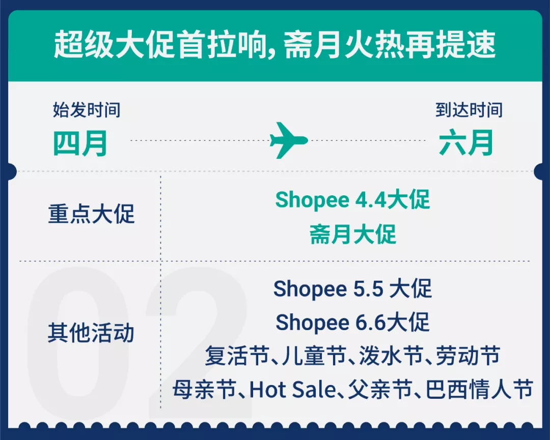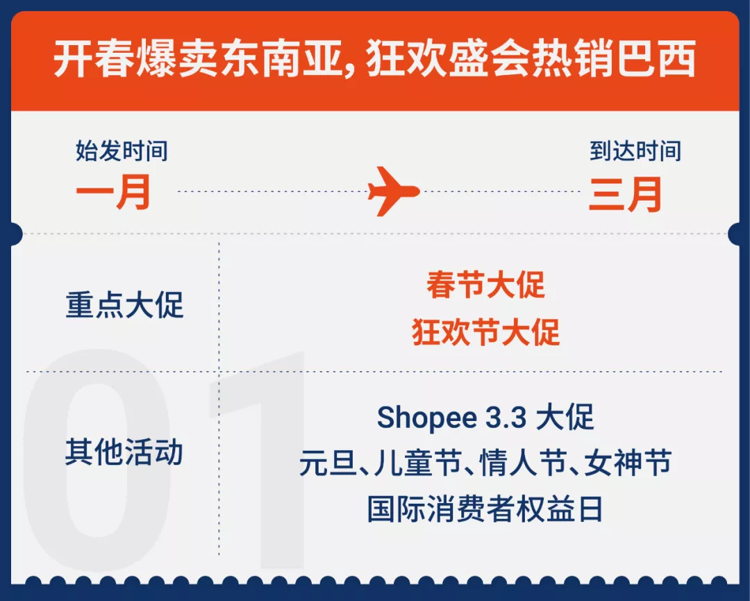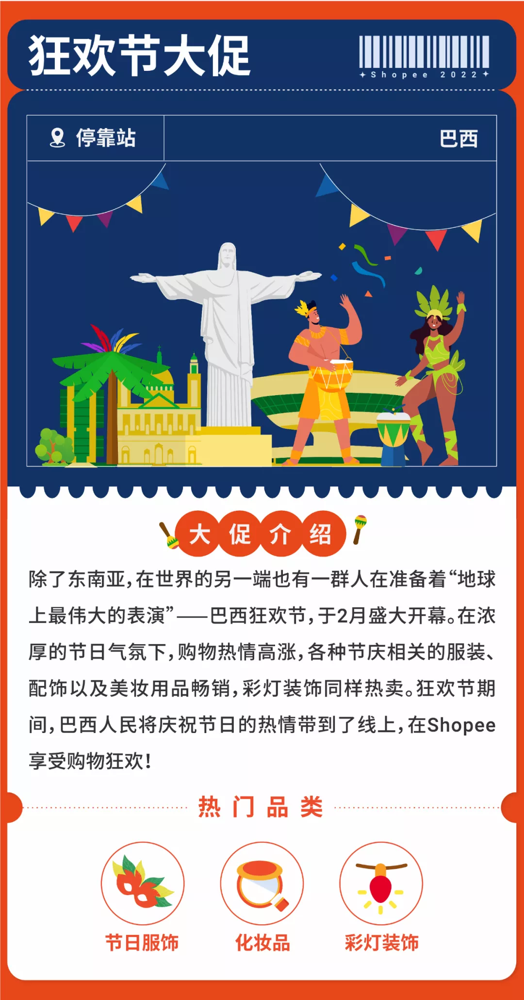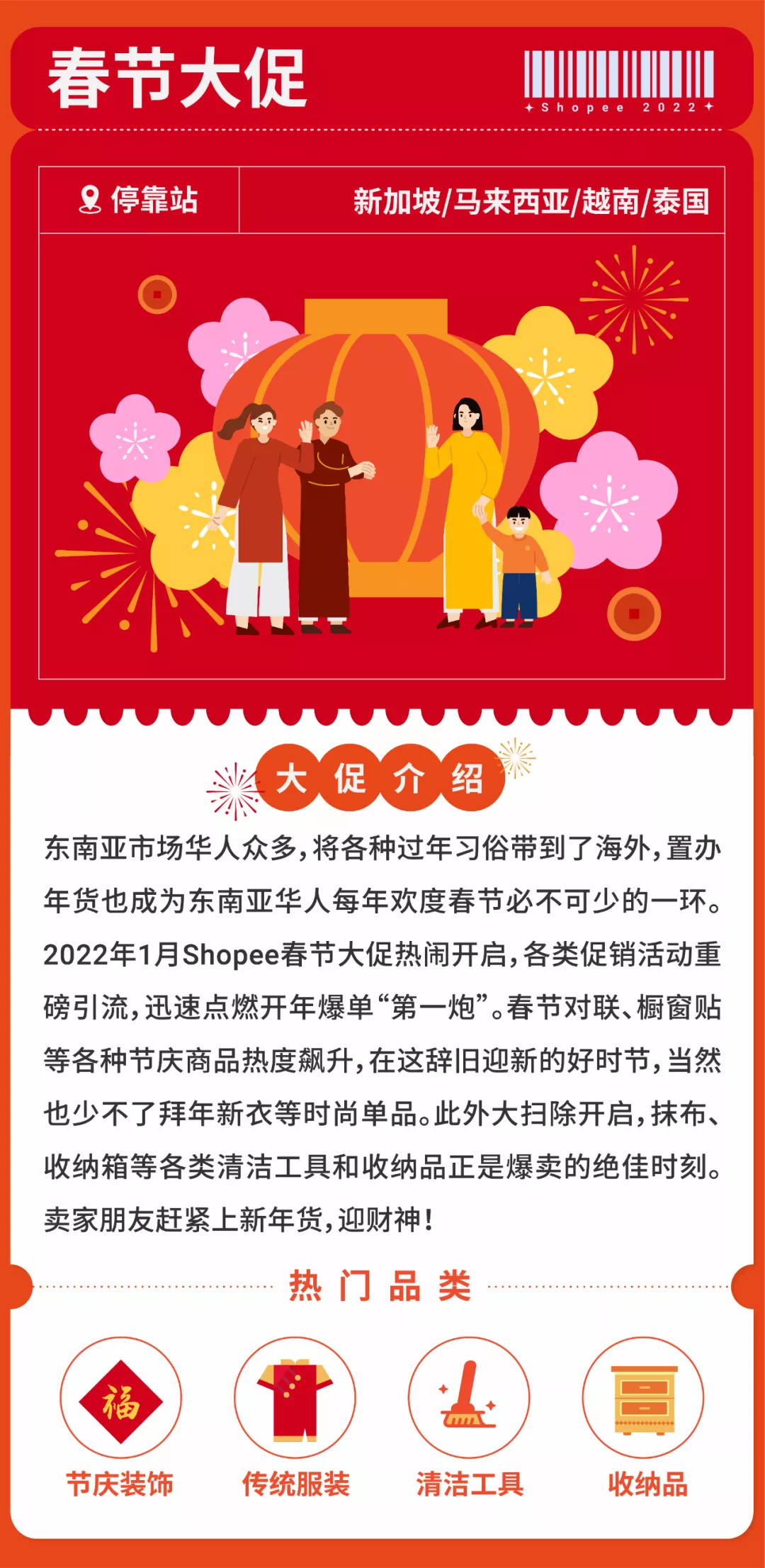 本次航班第一站从1月拉开序幕,Shopee以东南亚春节大促和巴西狂欢节大促等火热活动嗨翻全场,开局即“王炸”,2022一整年的爆单好运从此打开!爆单航班已启程,赶快下拉查看各停靠站的大促热卖机会点吧!