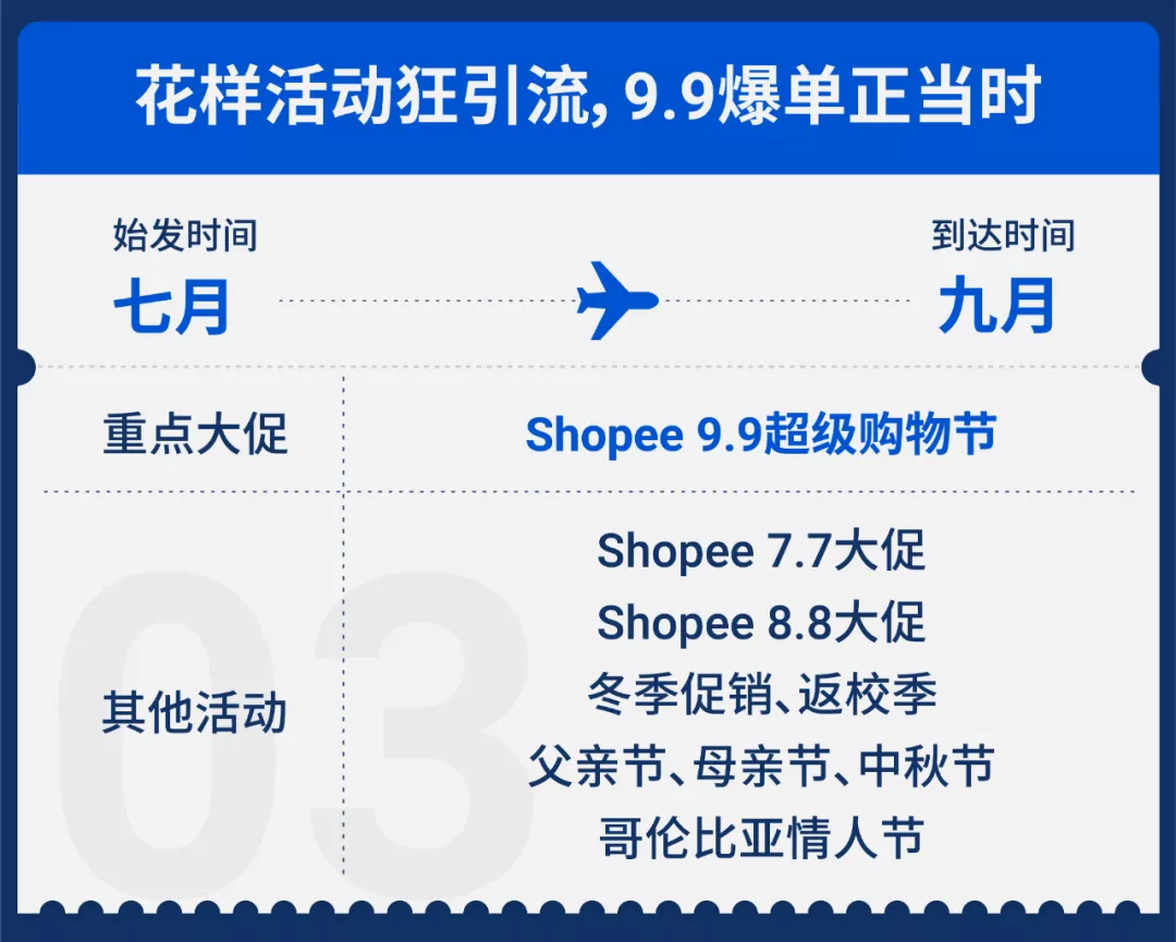 掘金号航班的第三站紧接着就迎来下半年旺季首场超级大促:Shopee 9.9超级购物节。7月和8月还有新市场巴西、哥伦比亚和智利的冬季促销,以及巴西和墨西哥的返校季等促销活动。流量加持推动9月筑起单量高峰,全品类疯狂吸金,嗨购全场!