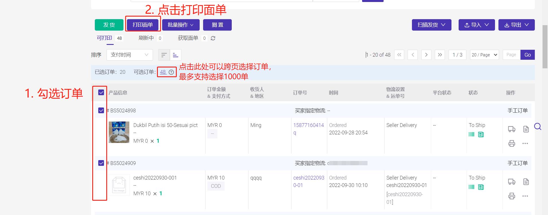 第三步:进入【待打单】列表选择想要打印的订单,点击打印面单
