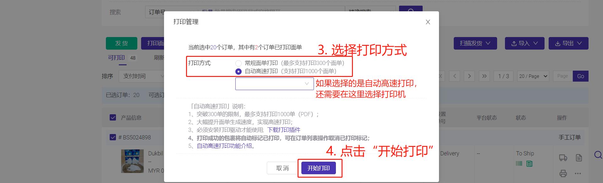 开启自动高速打印后,您需要设置默认打印方式,当打印订单不超过300个时,会按选中的默认打印方式进行打印。