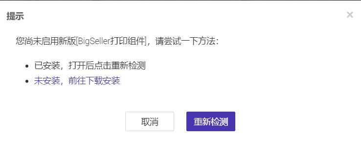 Q1: 没有开启/安装打印插件提示:“您尚未启用新版[BigSeller打印组件]”(如下图所示),解决方法: