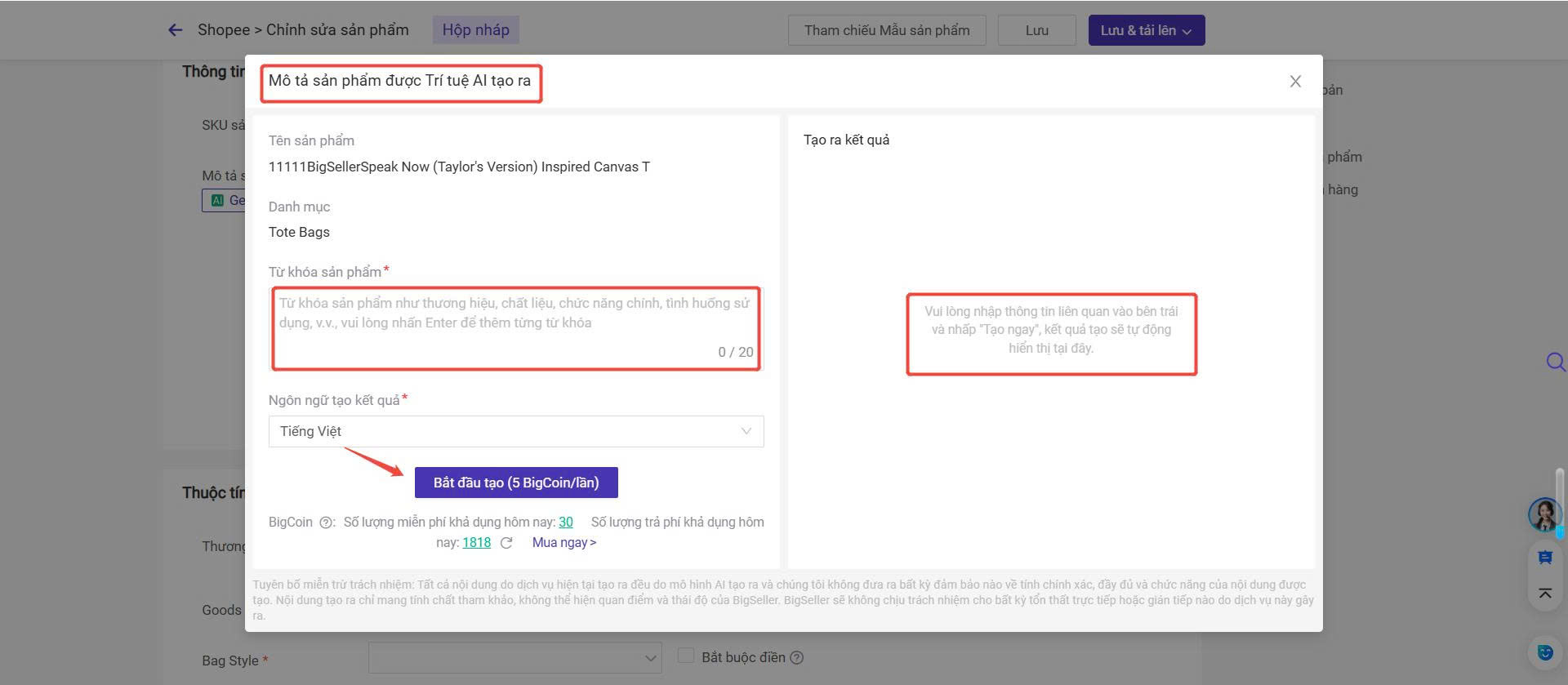 Phần mềm quản lý bán hàng đa kênh BigSeller có tích hợp tính năng gợi ý mô tả sản phẩm để hỗ trợ người bán hàng. Tuy nhiên, bạn không nên phụ thuộc hoàn toàn vào các gợi ý có sẵn. Thay vào đó, hãy xem đây là công cụ tham khảo, sau đó chủ động chỉnh sửa và điều chỉnh nội dung sao cho phù hợp với đặc điểm, công dụng thực tế của sản phẩm bạn đang bán.