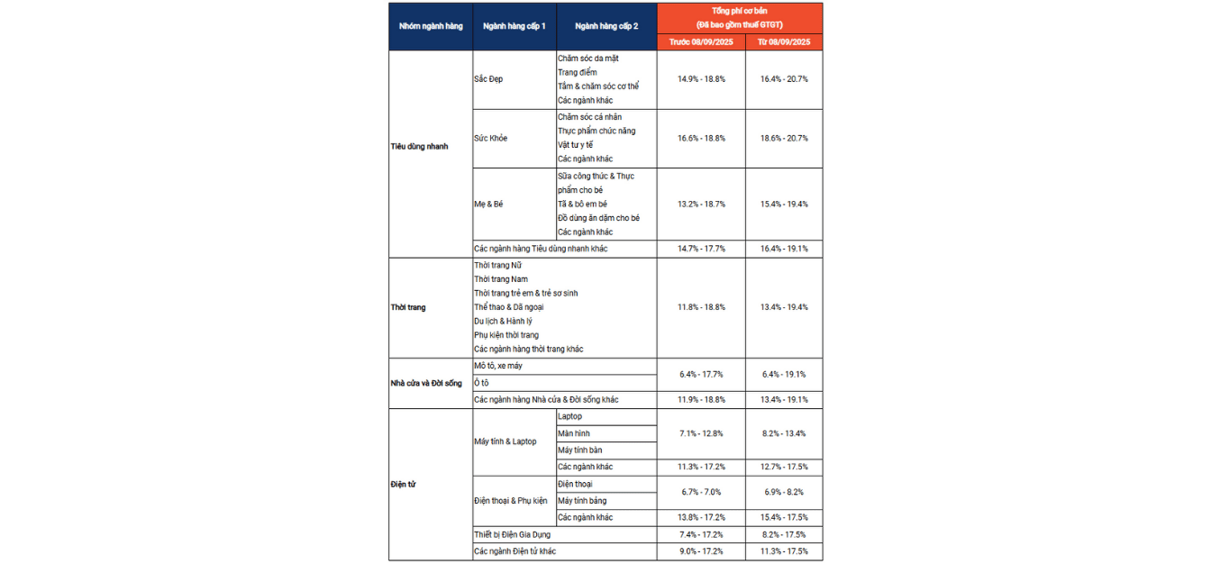Phí cố định = Giá trị sản phẩm * Tỉ lệ trăm phí cố định theo ngành hàng ( đã bao gồm phí GTGT)