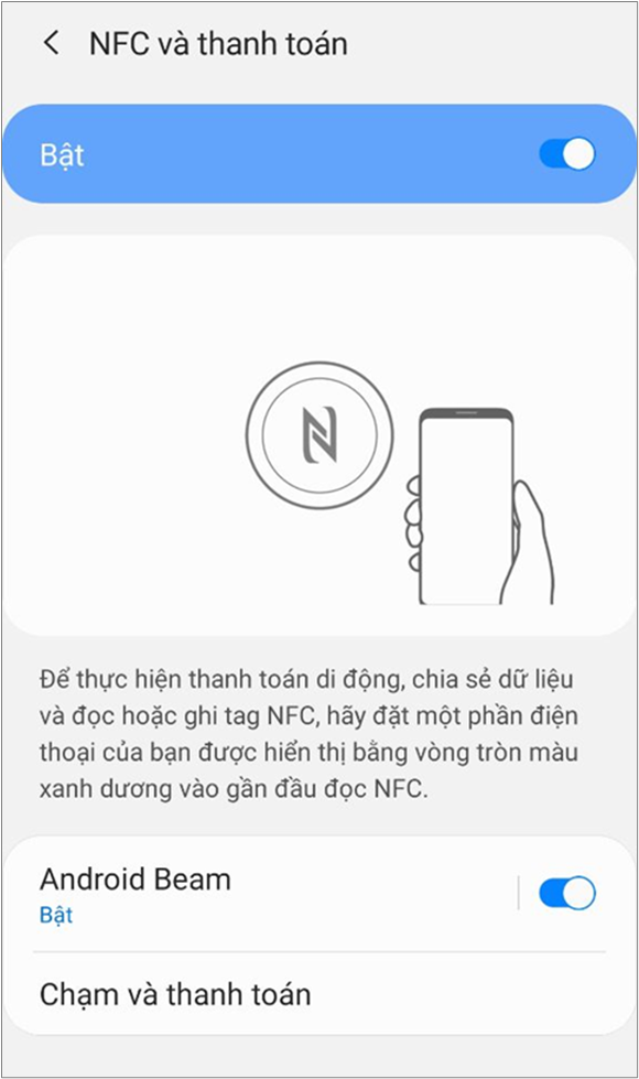 Hình ảnh ví dụ, mỗi thiết bị cài đặt NFC sẽ được bố trí khác nhau, người bản cần đảm bảo NFC luôn bật