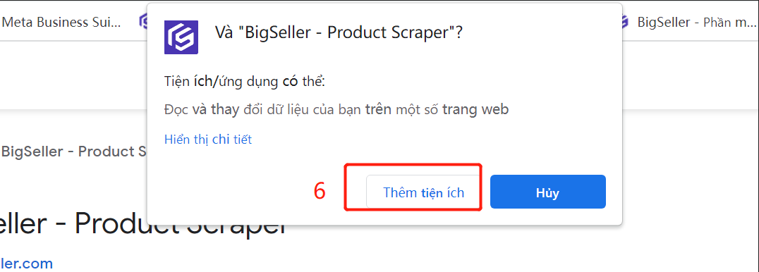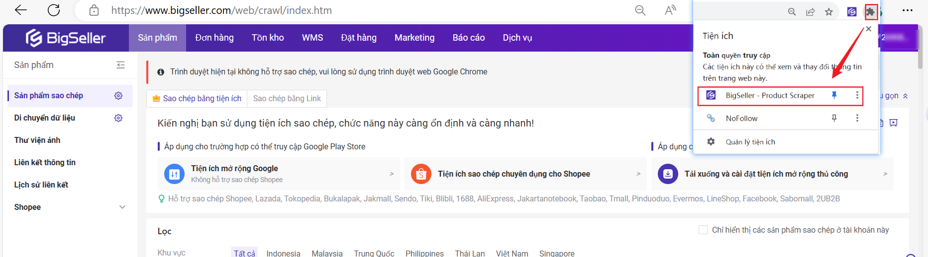Nếu bạn đã cài đặt tiện ích thành công, góc trên bên phải sẽ hiện ra tiện ích của BigSeller này như hình: