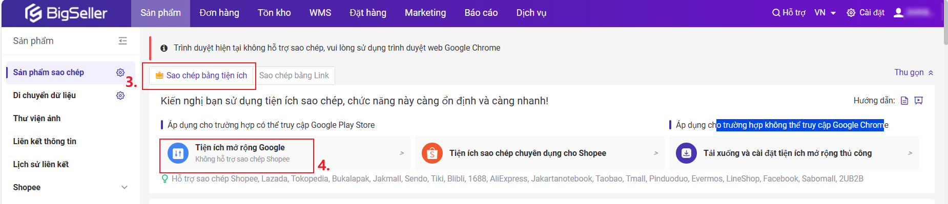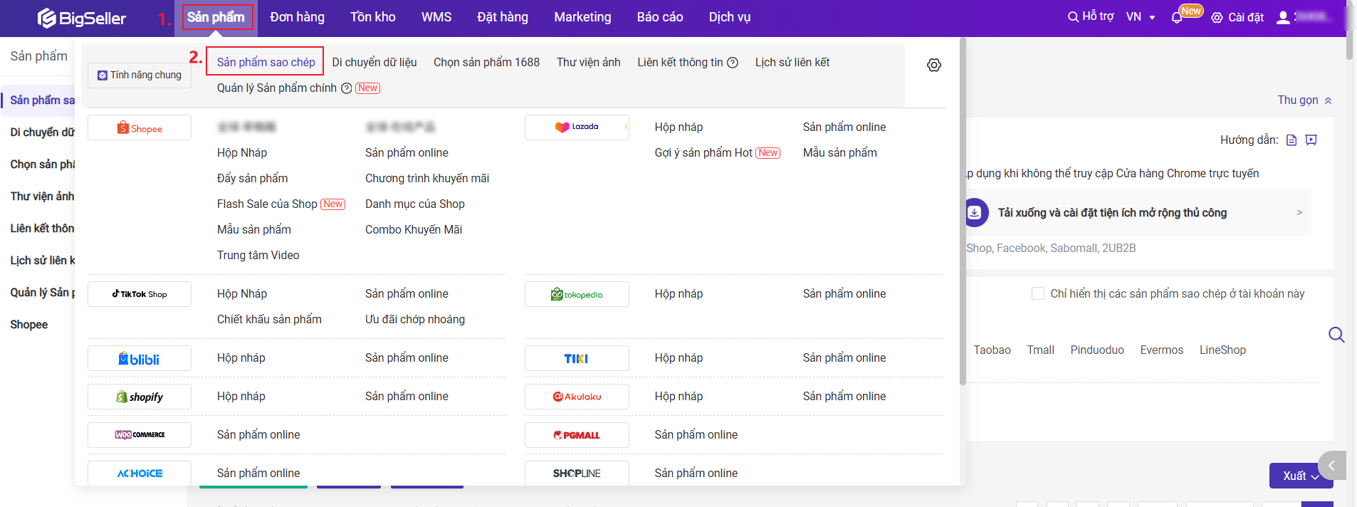 Tính năng nhân bản shop, sao chép sản phẩm giúp nhà bán tiết kiệm thời gian và tăng tốc độ lên sàn. Bạn chỉ cần chọn sản phẩm muốn “nhân bản”, sao chép sang BigSeller, tại BigSeller bạn có thể thoải mái chỉnh sửa tên, hình ảnh, mô tả, thuộc tính… cho phù hợp chiến lược từng shop trước khi đăng bán chính thức.