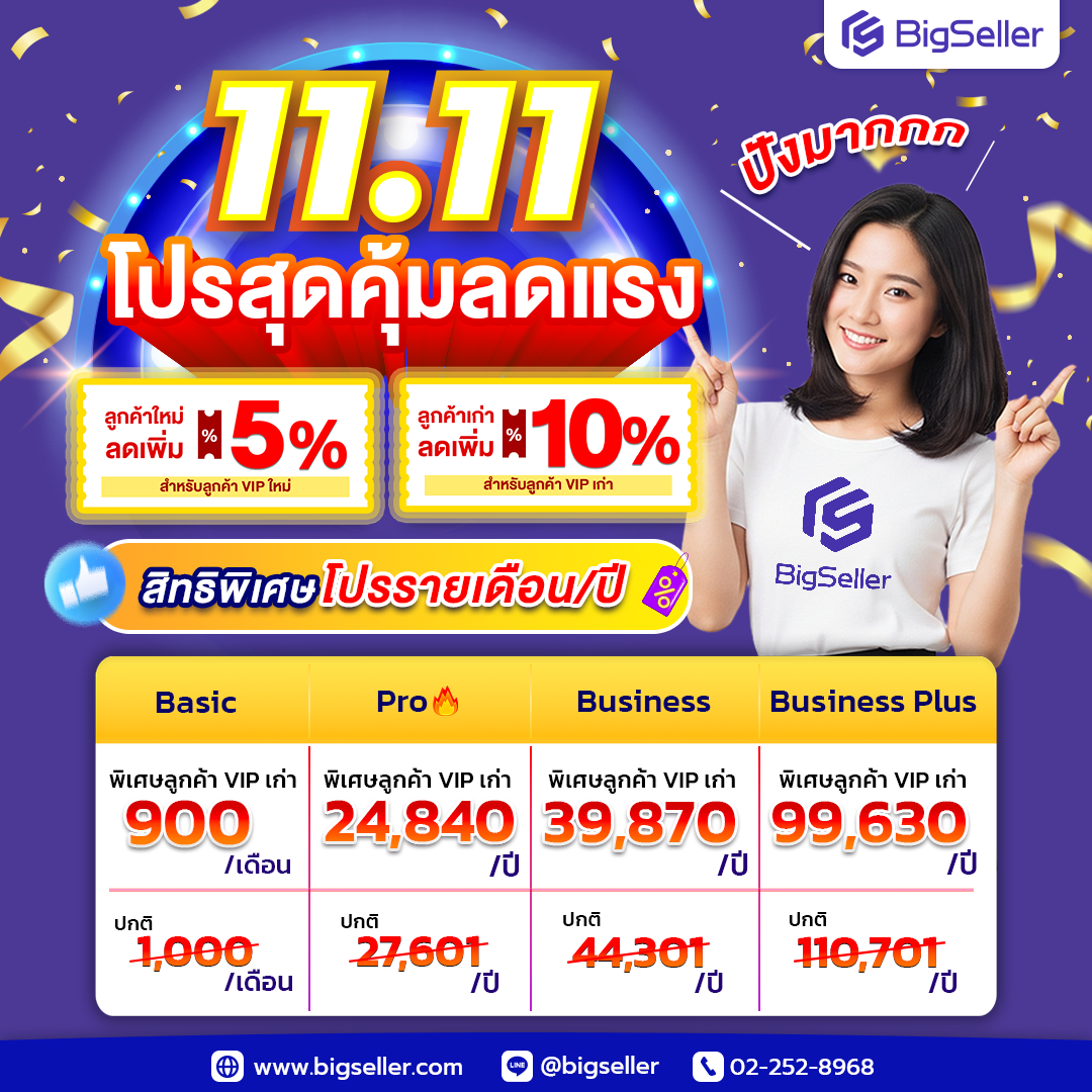 เตรียมตัวให้พร้อมกับเทศกาลช้อปปิ้งสุดยิ่งใหญ่ 11.11 ที่ปีนี้ BigSeller ขนโปรโมชั่นสุดพิเศษมาให้แบบจัดเต็ม! ไม่ว่าคุณจะเป็น ลูกค้าใหม่ ที่เพิ่งเริ่มต้นใช้ระบบ หรือ ลูกค้าเก่า ที่อยู่กับเรามานาน ก็มีสิทธิ์รับส่วนลดสุดคุ้มได้เหมือนกัน!