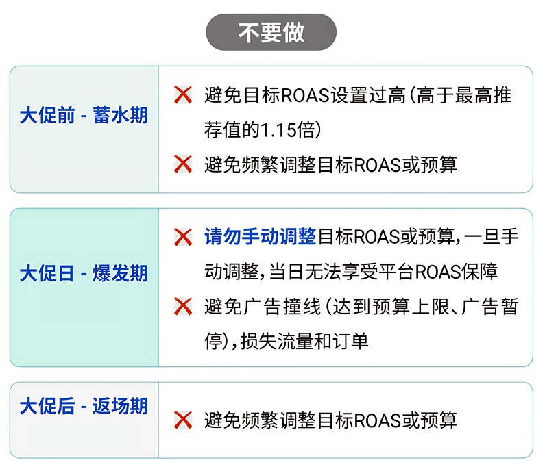 - 广告日预算需保持充足,建议至少为日常期的2~3倍