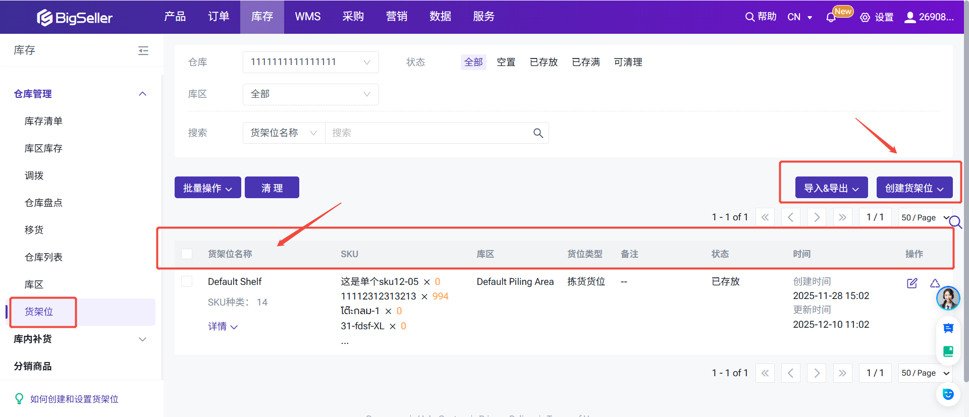 BigSeller的库区功能,货架位功能,能够将商品SKU分类储存,并且可以按照商品SKU的销量,体积来自定义货架位顺序