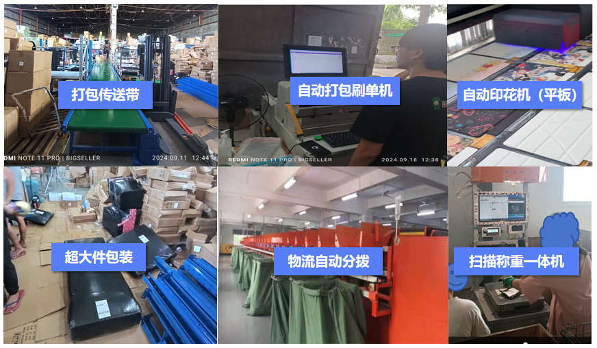 - 仓库设备:自动打包贴单机,扫描拍照,称重。物流分拣机,打包自制传输带。