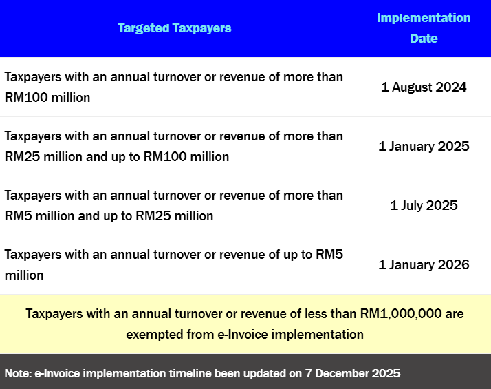 On 6 December 2025, the Cabinet approved an increase in the minimum annual sales threshold for mandatory e-Invoicing from RM500,000 to RM1 million.