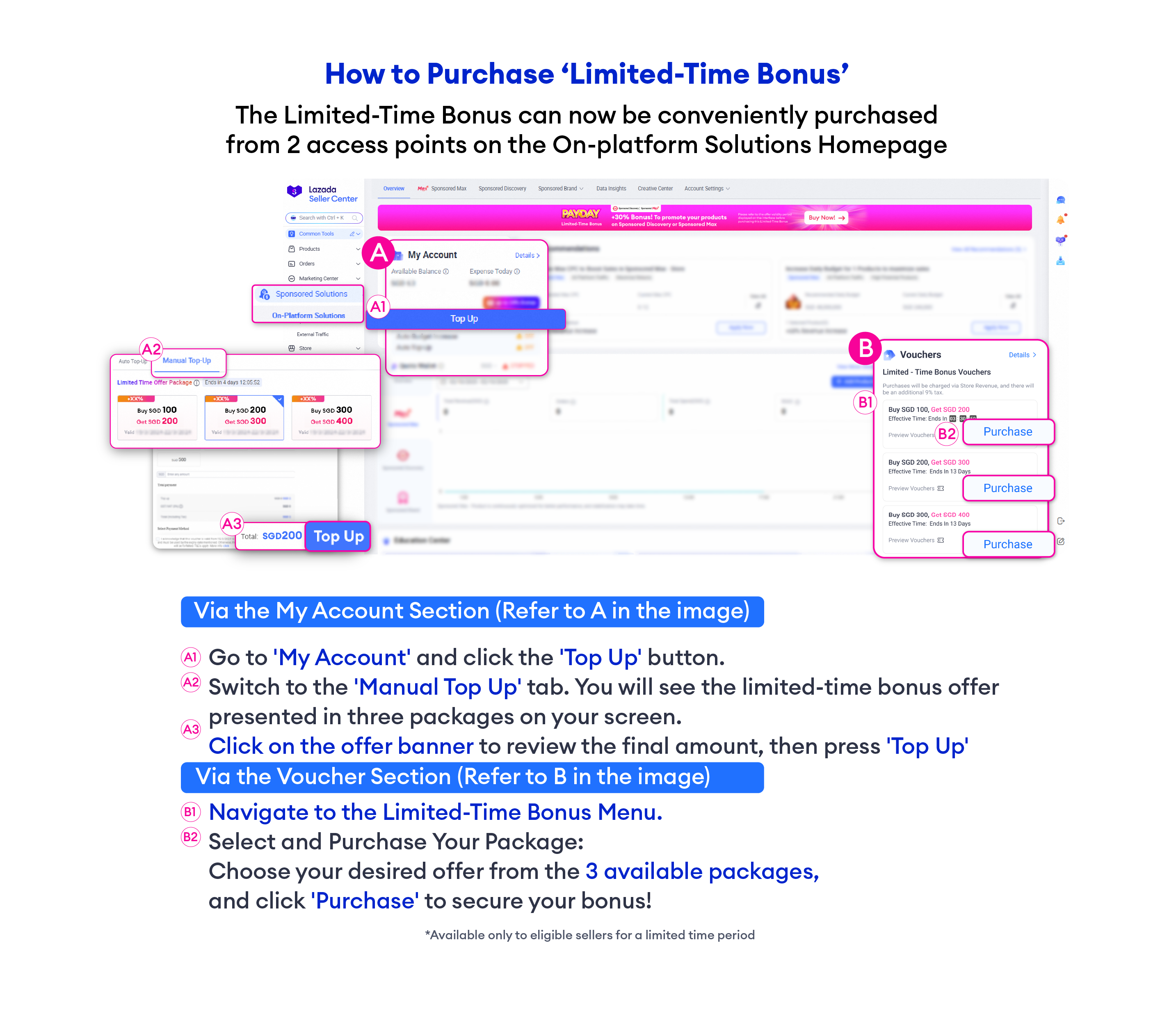 When eligible sellers add funds to their Sponsored Solutions balance, Lazada may issue bonus credits proportional to the top-up. These are usually auto-issued and appear in your voucher or balance area.