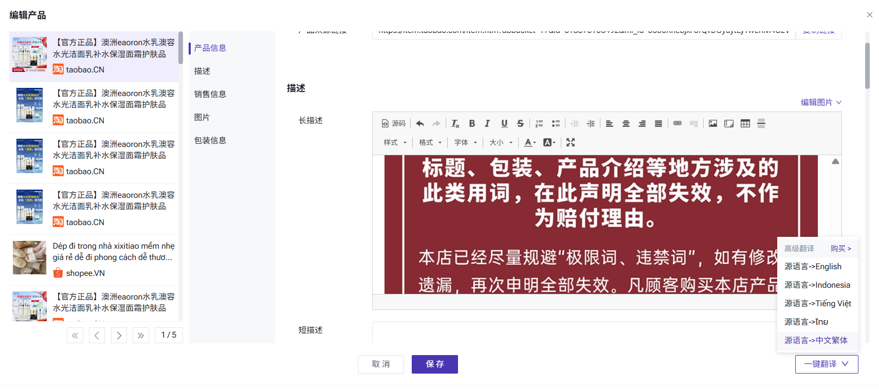 采集过来的产品可以通过BigSeller的翻译功能,讲中文等语种翻译成,东南亚各国语种,同时支持将图片上面的中文翻译成对应市场的语种