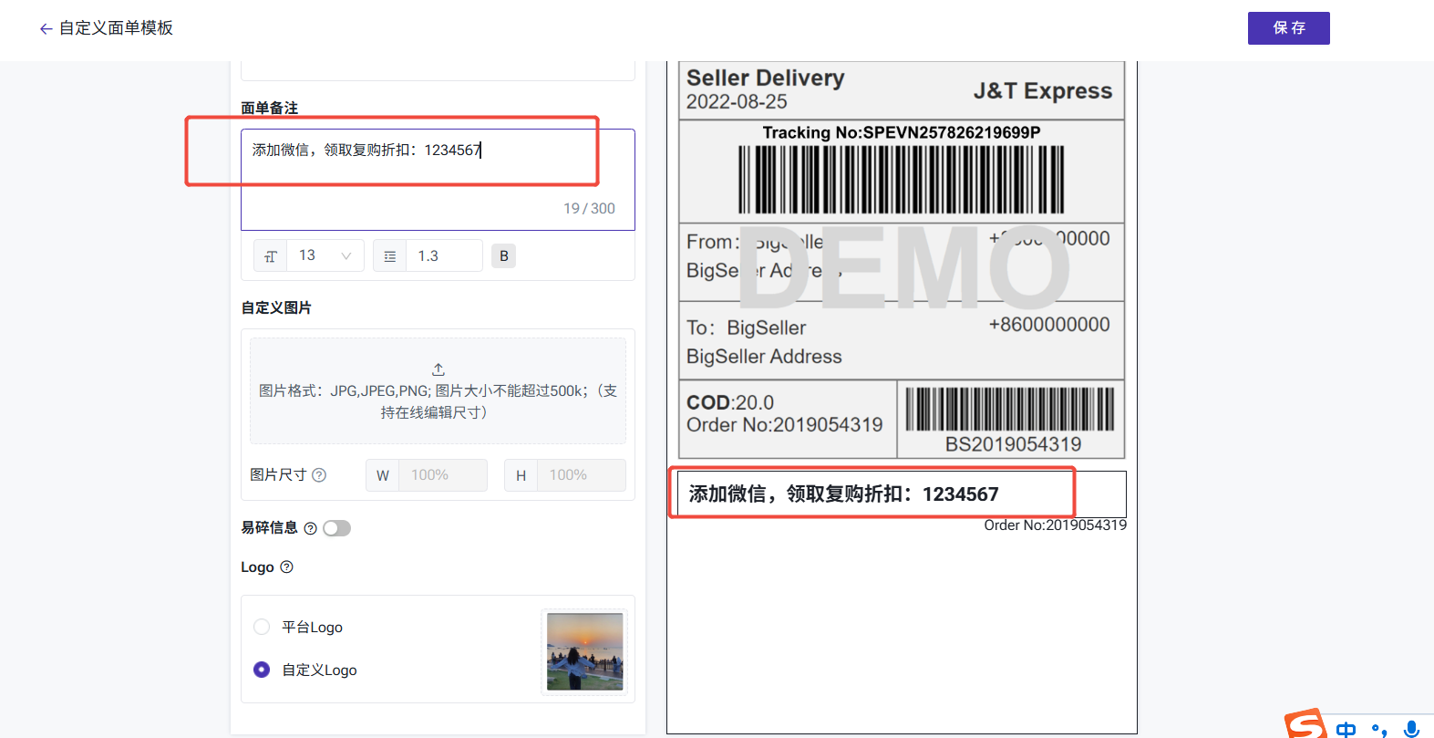 平台的面单是有固定的模板的,但是BigSeller的面单是可以支持卖家自定义的,卖家可以在面单上方式放上自己