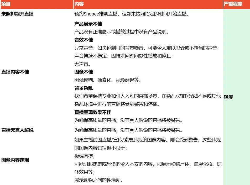 仅发送警告提示,并且在Shopee直播页上降权,从而导致流量和浏览量减少,还可能导致直播终止