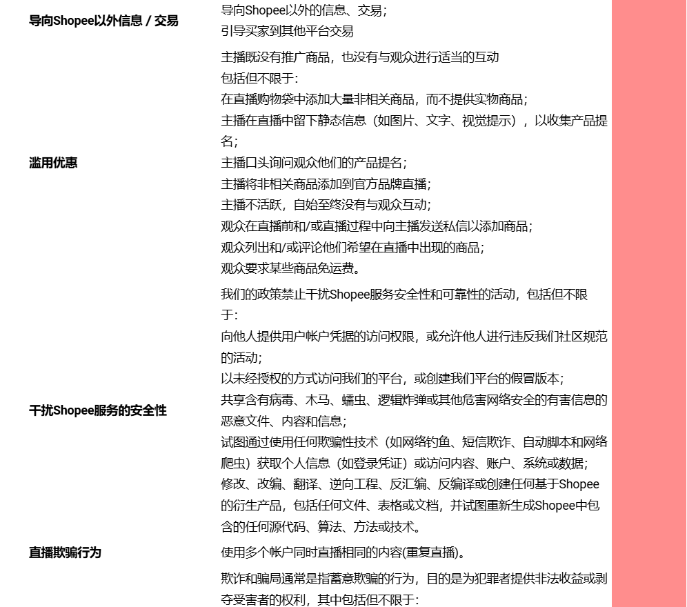 - 若您的直播内容不符合规范的时候,Shopee会在您直播的设备上显示违规信息通知,并于事后推送提醒,请多加留意直播时设备上出现的提示信息,具体直播规范如下。