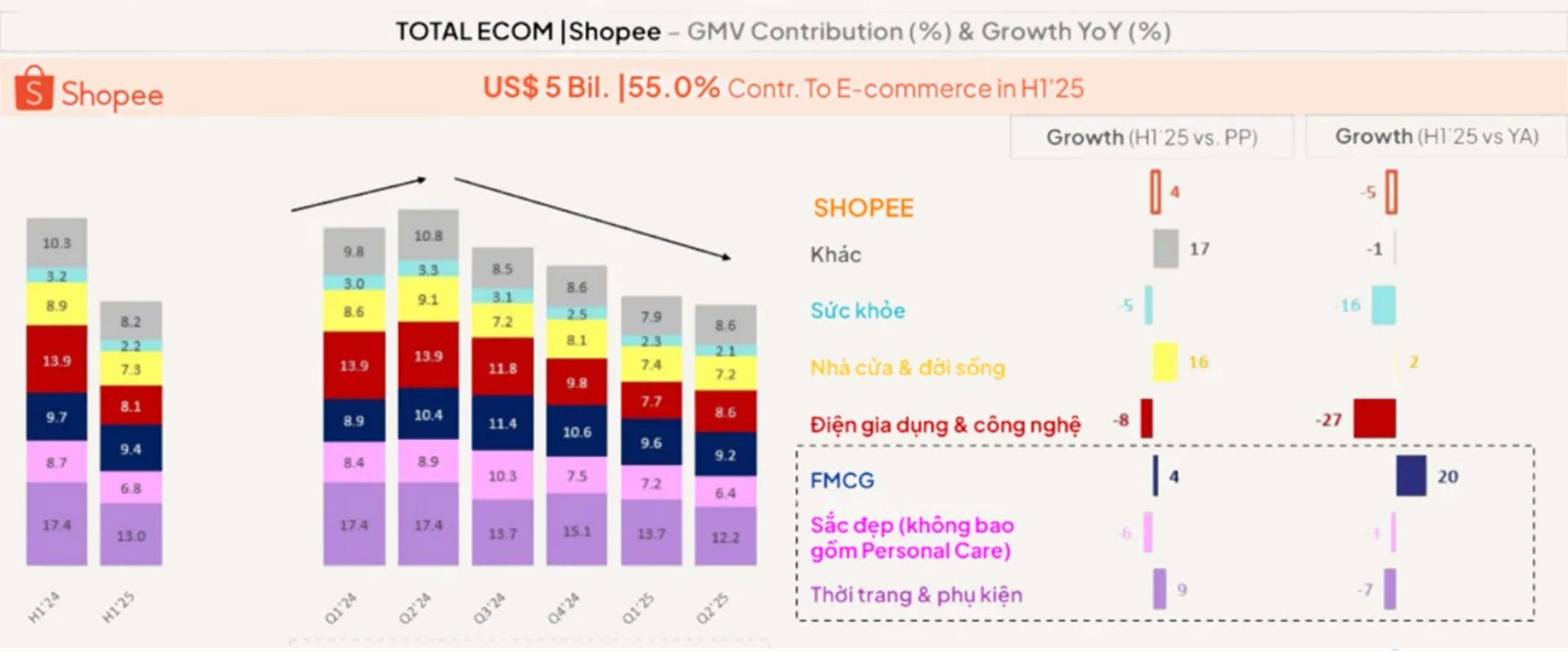 Shopee GMV tăng trưởng theo danh mục sản phẩm H1 2025