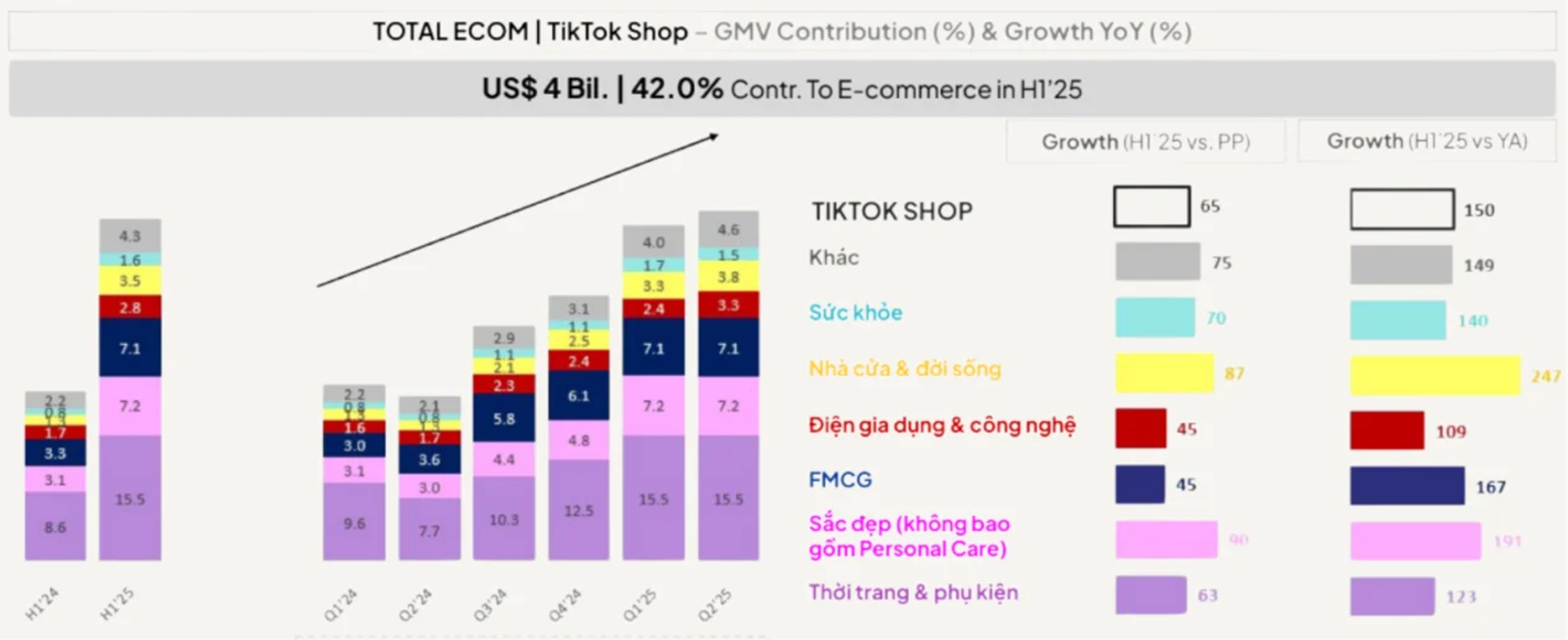 Biểu đồ 2: Tổng GMV và tỷ lệ tăng trưởng YoY của TikTok Shop theo danh mục sản phẩm (Nguồn: YouNet ECI)