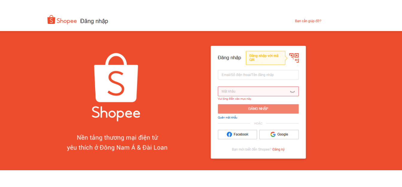 Đây là hình thức đăng nhập tài khoản Shopee truyền thống, phù hợp với người dùng đã đăng ký tài khoản Shopee bằng số điện thoại, email hoặc tên đăng nhập.
