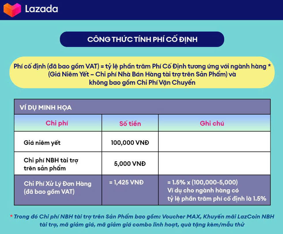 Phí cố định Lazada được tính dựa trên giá sản phẩm sau khi đã trừ voucher của shop, nhân với tỷ lệ phí cố định đã bao gồm VAT. Lazada thường có chính sách miễn phí cố định trong 90 ngày đầu cho người bán mới. Đây được xem là giai đoạn thuận lợi để thử nghiệm sản phẩm và đẩy mạnh doanh số mà không phải chịu áp lực từ khoản phí này.