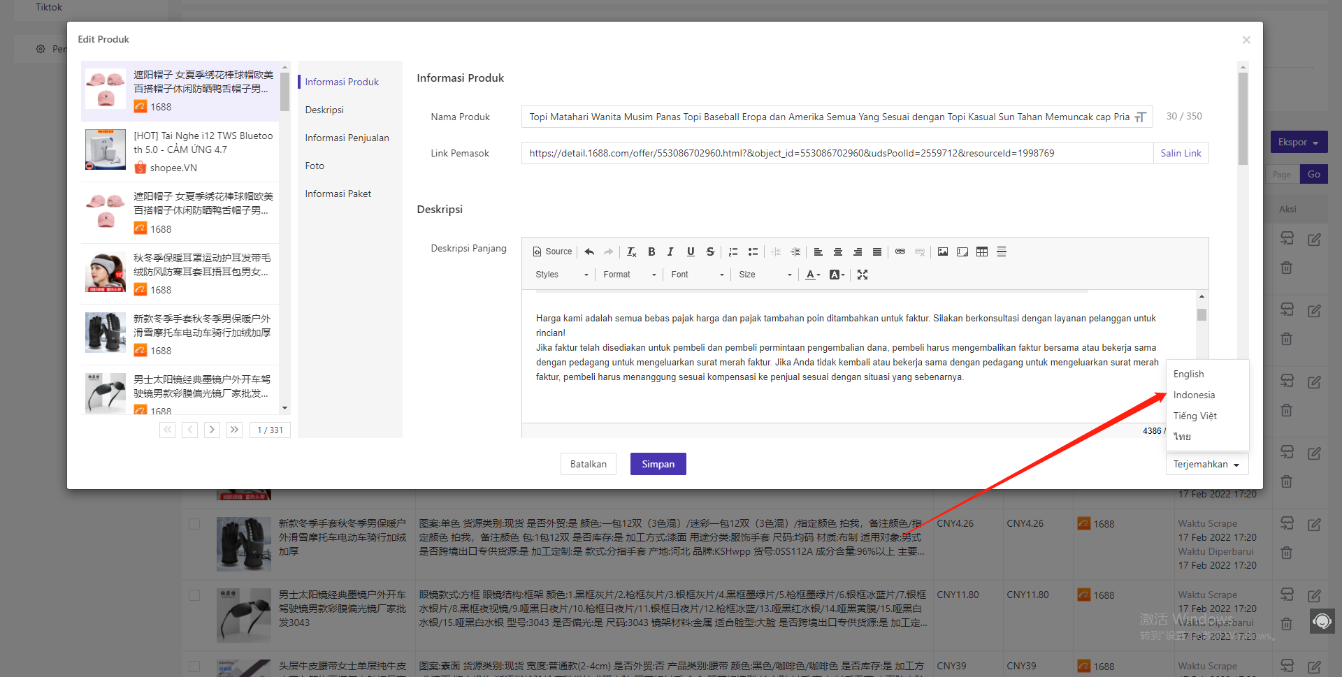 Eits, semuanya bahasa mandarin, jangan khawatir bigseller juga menyediakan fitur untuk menerjemahkan produk menjadi bahasa. Jadi data produk yang telah masuk ke daftar scrape anda dapat translate menjadi bahasa Indonesia.