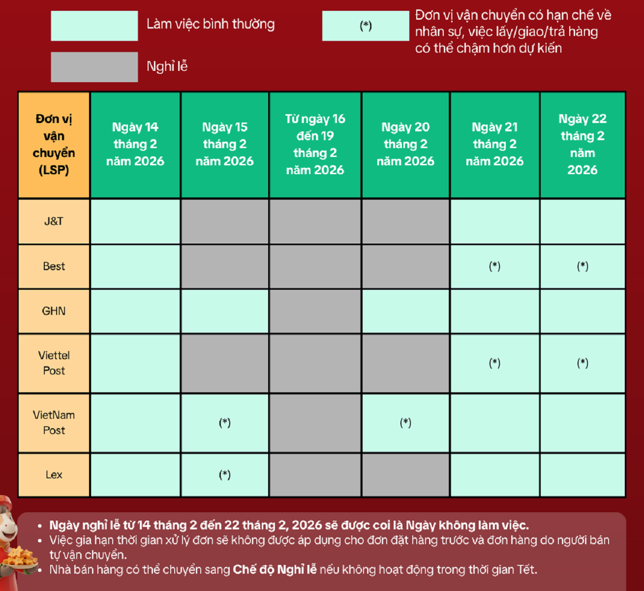 Từ 15/02 đến 22/02/2026, hầu hết đơn vị vận chuyển đều nghỉ hoặc hoạt động hạn chế. Một số vẫn nhận đơn nhưng với nhân sự giới hạn, việc lấy – giao – trả hàng có thể chậm hơn dự kiến. Vì vậy, người bán nên cân nhắc: