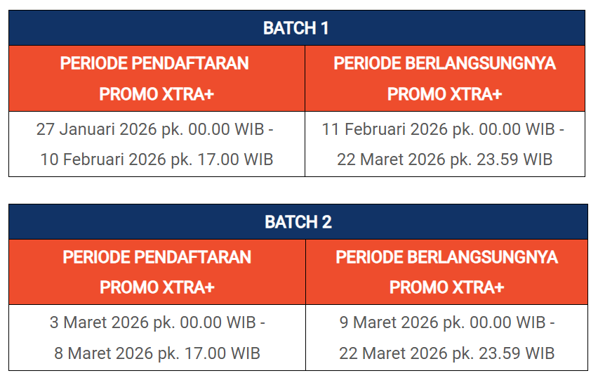 Program Promo XTRA+ Idul Fitri 2026 dibuka dalam dua batch dengan jadwal yang berbeda. Perhatikan baik-baik karena konsekuensi biayanya juga tidak sama: