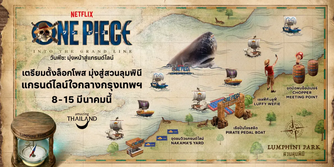 คำตอบคืออีเวนต์ Grand Line in Thailand ที่จัดขึ้นใน Lumphini Park ใจกลางเมือง โดยเป็นโปรเจกต์ที่ได้รับแรงบันดาลใจจากแฟรนไชส์ระดับโลกอย่าง One Piece ซึ่งถูกนำมาสร้างประสบการณ์ให้แฟน ๆ ได้สัมผัสโลกของโจรสลัดในชีวิตจริง