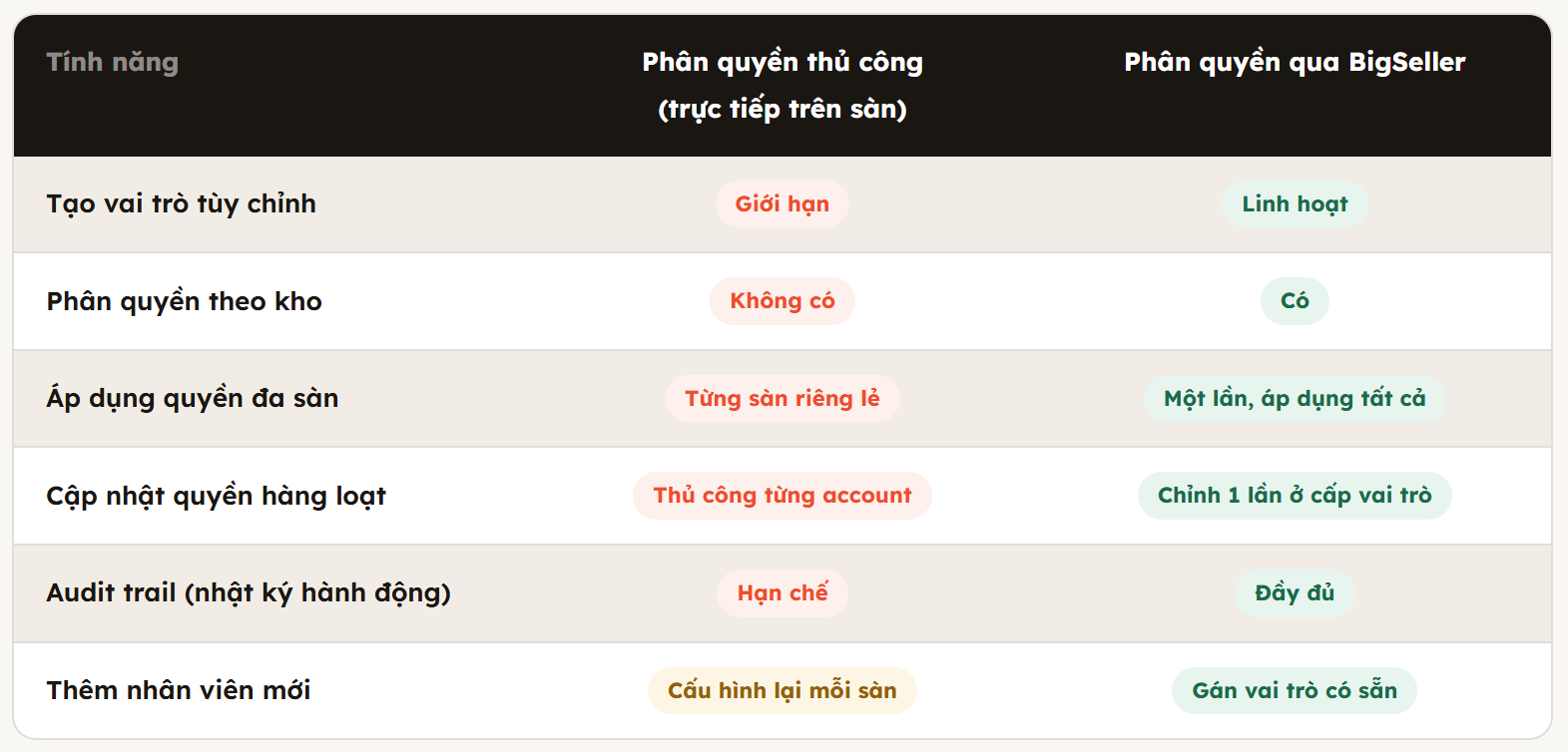 Khi sử dụng phần mềm quản lý bán hàng như BigSeller, toàn bộ phân quyền được quản lý tại một điểm trung tâm duy nhất. Điều chỉnh quyền ở cấp vai trò tự động áp dụng cho tất cả tài khoản thuộc vai trò đó, trên tất cả sàn được kết nối. Thêm nhân viên mới chỉ cần gán vai trò có sẵn thay vì cấu hình lại từng sàn từng kho riêng lẻ.