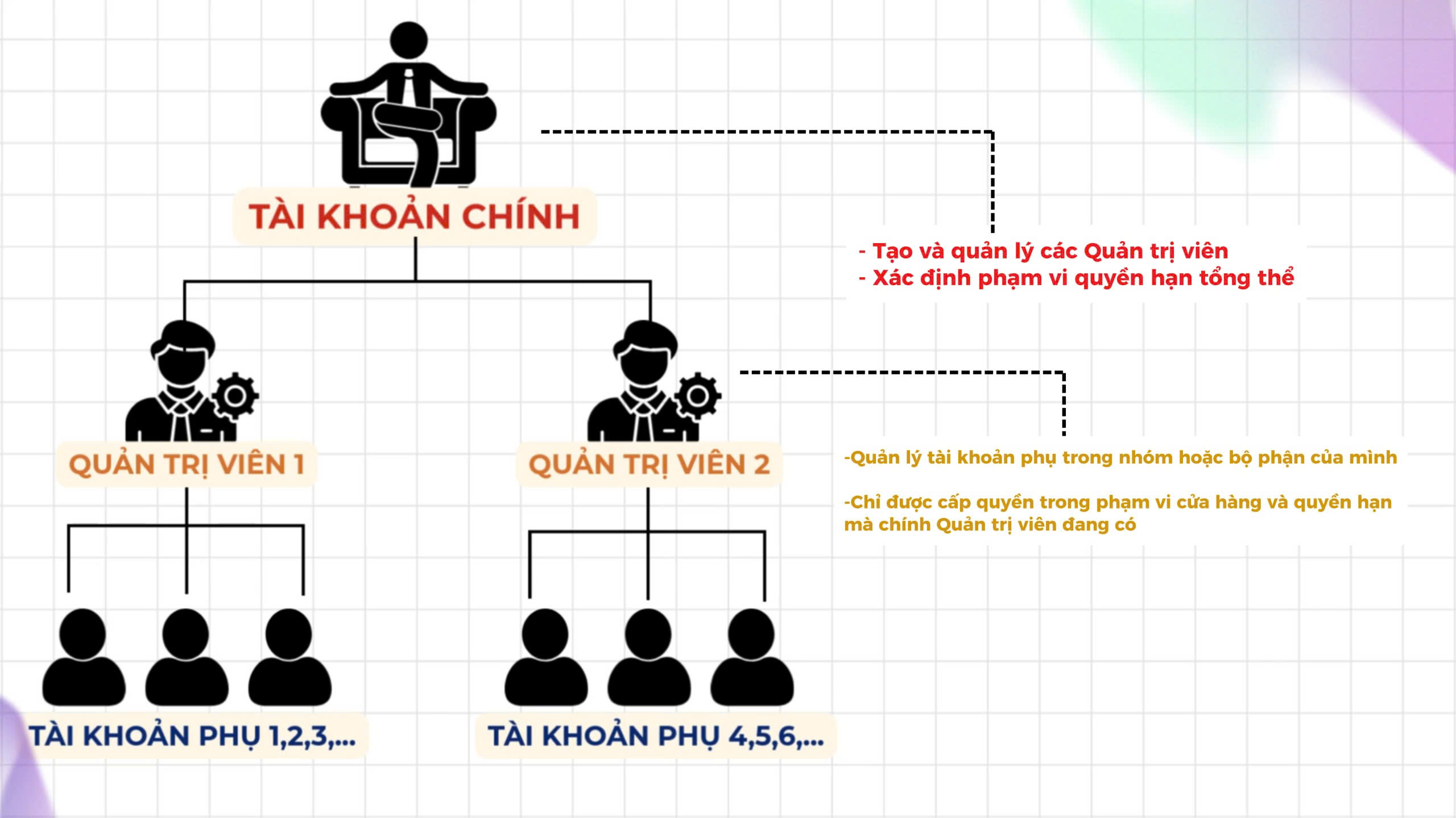 Giới hạn của Admin: không xem dữ liệu tài chính nhạy cảm, không thay đổi cấu hình nền tảng, không cấp quyền vượt quá quyền của chính mình.