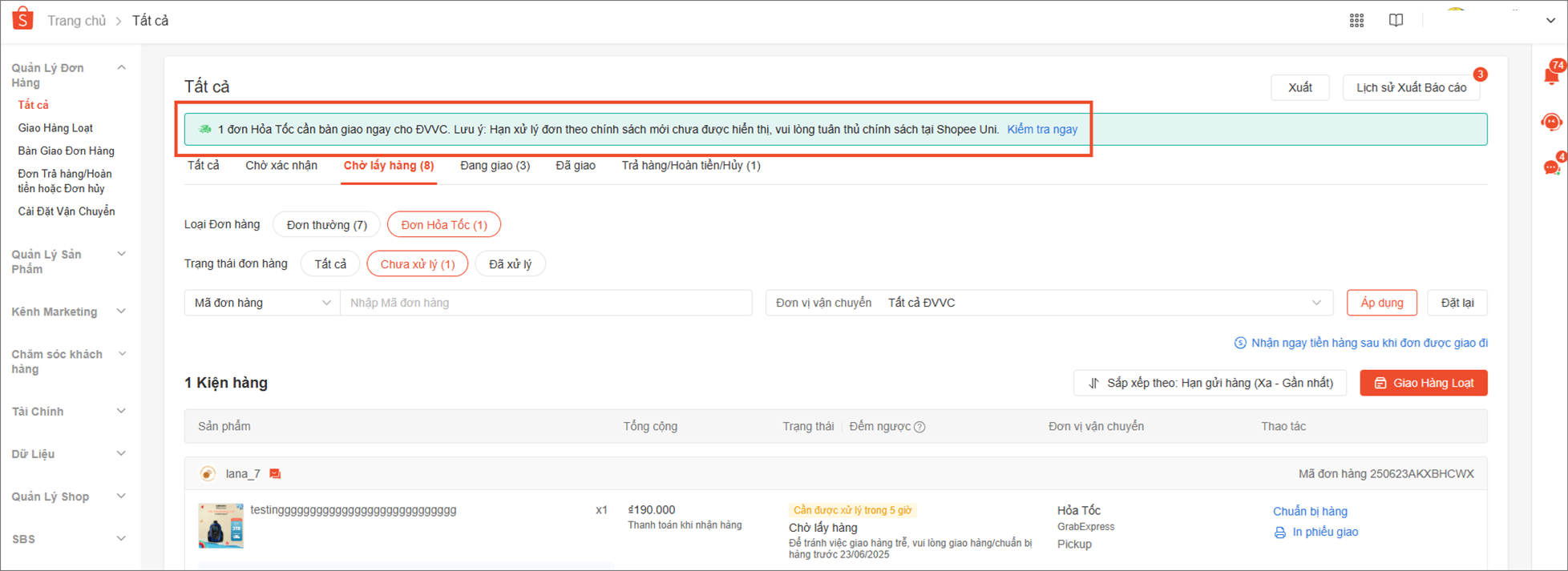 Hạn xử lý đơn theo chính sách chưa được hiển thị trên Kênh Người Bán, Người bán có thể lọc đơn Hỏa Tốc hoặc Trong Ngày tại mục Quản Lý Đơn Hàng > Tất cả > Đơn Hỏa Tốc để theo dõi xử lý đơn nhanh chóng, hiệu quả hơn.