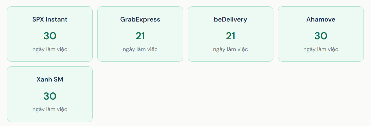 Tùy ĐVVC: SPX Instant, Ahamove và Xanh SM lưu kho 30 ngày làm việc; GrabExpress và beDelivery lưu 21 ngày làm việc. Sau thời hạn này, hàng sẽ bị tiêu hủy và ĐVVC không chịu trách nhiệm.