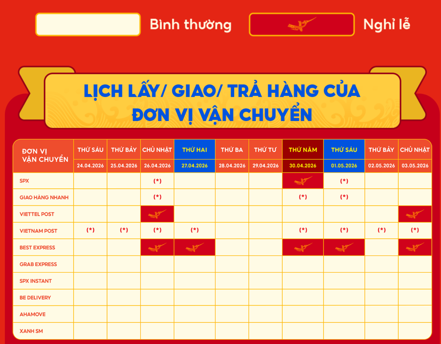 | GHN | Không nghỉ | 26/04, 30/04, 01/05 |