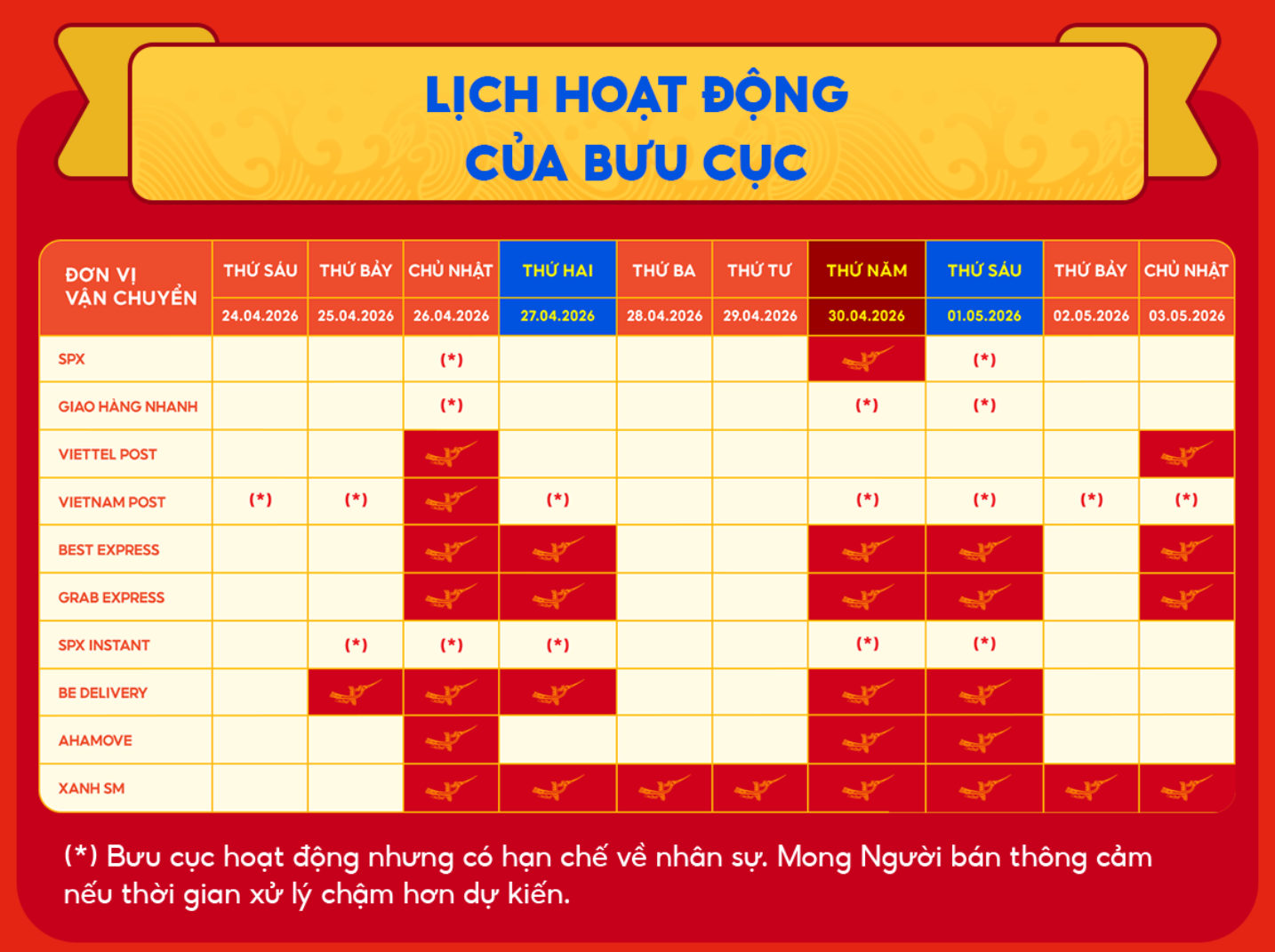 👉 Khuyến nghị quan trọng: Nên gửi hàng trước 16h ngày 29/04, đây là mốc “an toàn” cuối cùng để đơn kịp xuất kho trước khi các kho tổng nghỉ lễ. Nếu bạn gửi hàng sau 16h ngày 29/04, khả năng cao hàng sẽ bị giữ tại bưu cục địa phương cho đến tận ngày 01/05 hoặc 02/05 mới bắt đầu được xử lý để đi kho tổng, điều này làm tăng rủi ro đơn bị khách hủy do chờ đợi quá lâu.