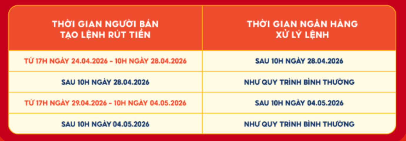 → Do ngân hàng nghỉ lễ. Các lệnh sau 17h ngày 29/04 sẽ chỉ được ngân hàng xử lý vào ngày 04/05/2026.