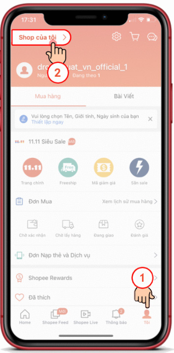 Cách truy cập kênh người bán Shopee qua điện thoại: chọn mục Tôi >> Shop của tôi.