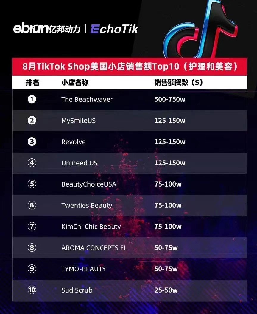 此外,值得一提的是,TikTok Shop 美国站已经出现销售额超过 500 万美元的店铺,具体榜单如下: